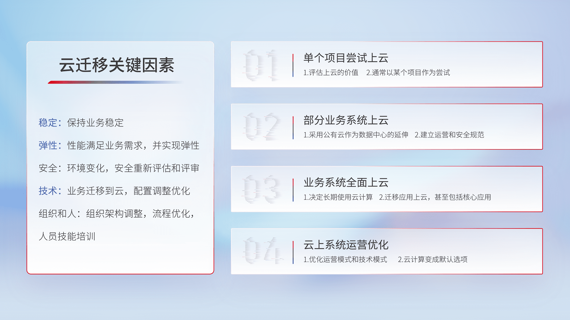 结合实际业务,,,从规划设计、、云平台选型、、、云原生改造、、、、数据迁移、、集成交付,,,,迁移全过程为客户识别最佳上云路径,,,做好风险识别管理,,设计网络架构、、、身份权限、、安全审计合规、、、操作审计、、日志审计、、、、监控告警策略、、、多站点容灾设计等,,,,对云上基础设施进行整体规划,,,,提升IT治理水平,,,,以满足弹性、、、高可用、、、高性能的需求。。。