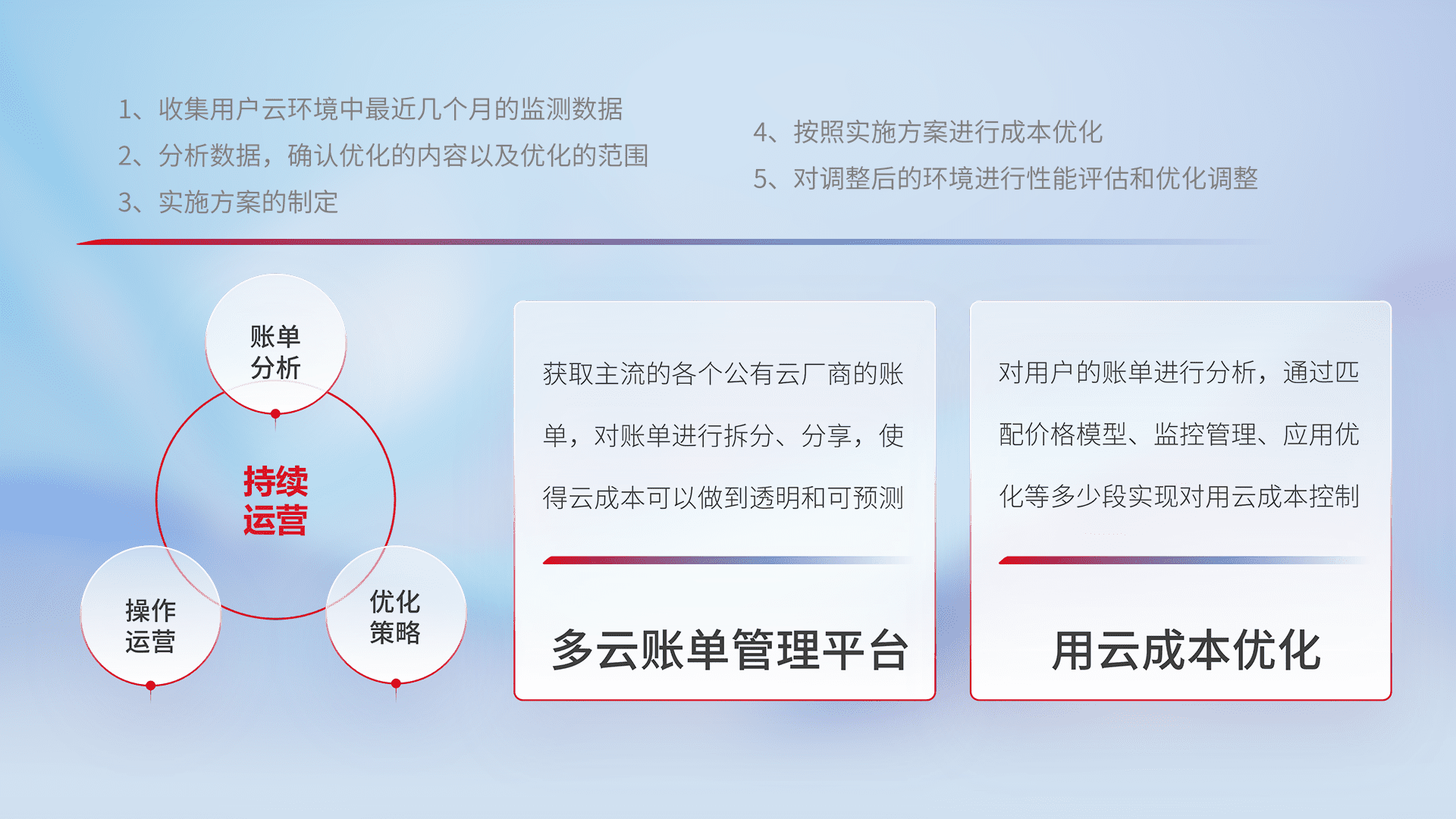 通过多云纳管,,以统一的资源数据模型把客户的云资源进行抽象和封装,,进而实现对多云资源的统一操作,,保障云资源管理的可靠性、、、、稳定性与可用性。。。。量身定制化运维内容,,,配置、、、开发运维、、、、补丁管理、、、、备份、、、监控、、、认证和访问管理、、、、审计和日常巡检等,,保障在用云过程中的可靠度,,稳定度以及高可用率。。
